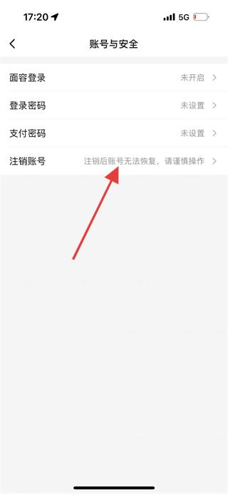 4、在账号与安全页面,点击注销账号,进入注销原因选择页面。