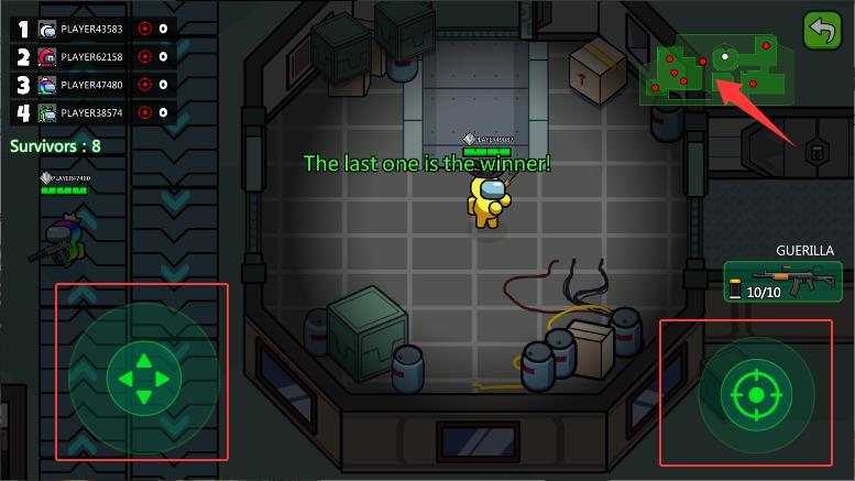 4、左手滑动屏幕控制角色移动走位,右手操作瞄准并点击射击按钮,注意小地图上红色标记的敌人位置。