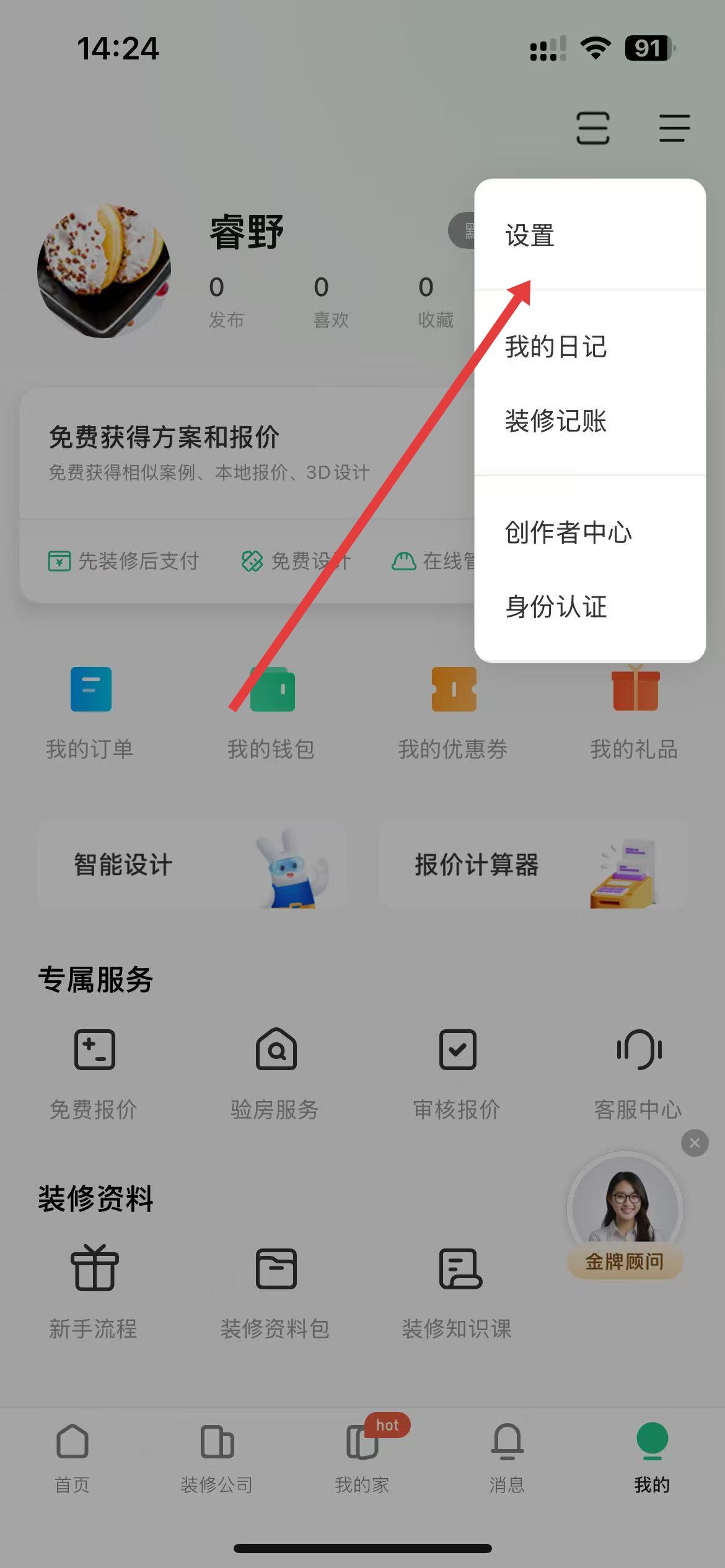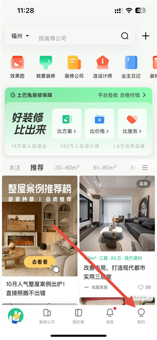 1、打开土巴兔APP,点击底部导航栏的我的选项,在个人页面右上角,点击菜单图标。