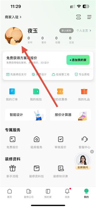 1、打开土巴兔装修app,进入我的页面后点击个人主页,进入个人资料页面。
