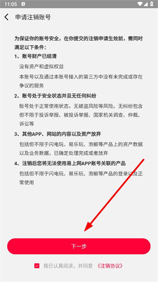 4、在申请注销账号页面勾选同意注销协议后,点击下一步,即可按流程注销账号。