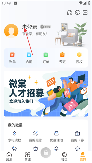 1、在微棠首页,点击页面右下角我的,可进入个人相关页面。