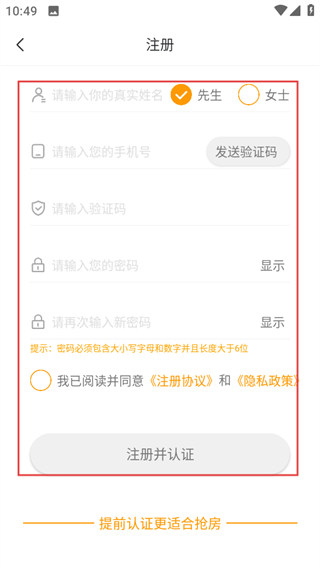 4、在注册页面,按要求填写信息,同意协议后点击注册并认证即可完成注册。