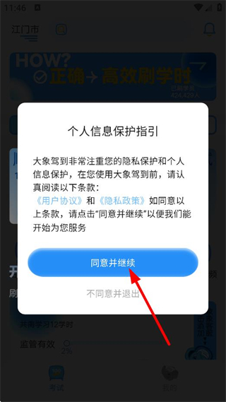 1、在个人信息保护指引中,点击同意并继续,进入APP。