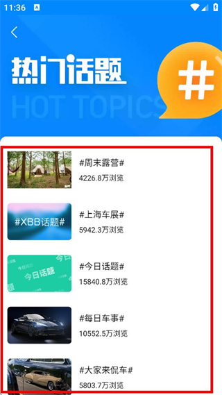 4、在热门话题页面,可查看周末露营、上海车展等热门话题数据。