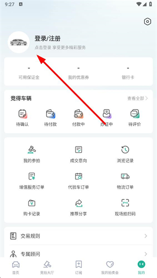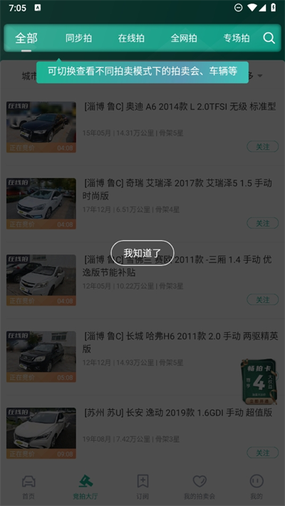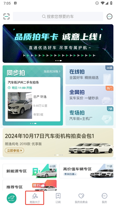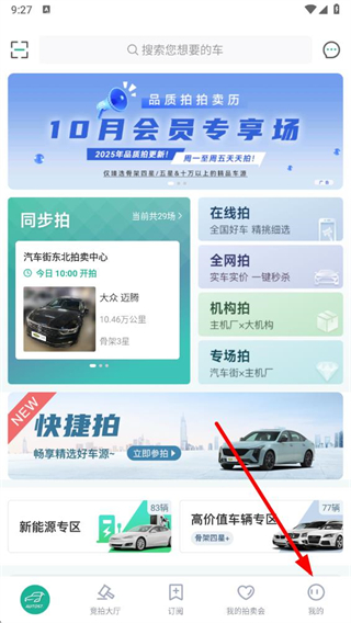 2、进入后可以看到最上方一栏,适用于切换查看不同拍卖模式下的拍卖会、车辆等;