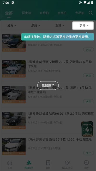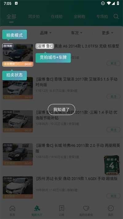 3、在下方条件筛选栏目中,可以在图片中看到现在拍卖模式,并查看拍卖状态和竞拍城市和车牌;