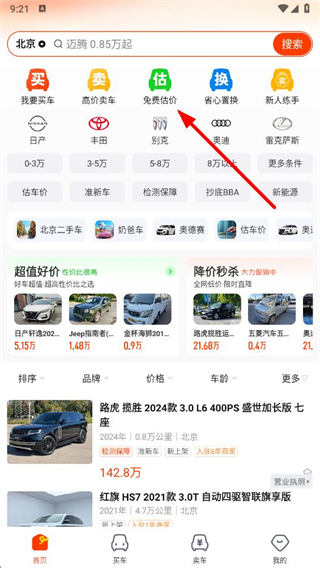 1、在人人车首页找到绿色免费估价按钮,点击进入估价流程。