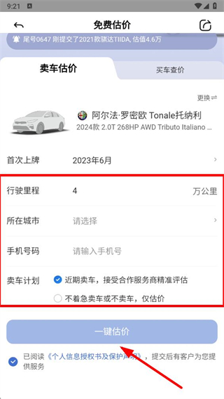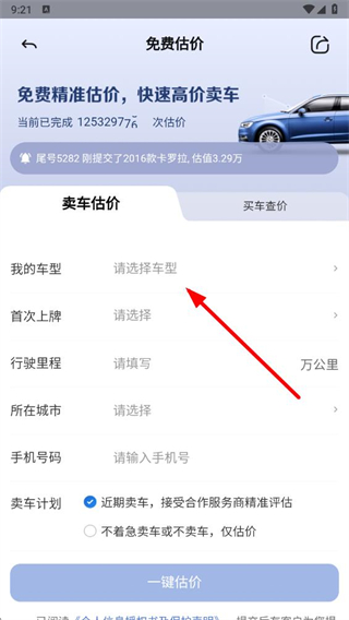 4、填写行驶里程、所在城市、手机号码,选择卖车计划后,点击一键估价按钮,即可完成二手车估价申请。