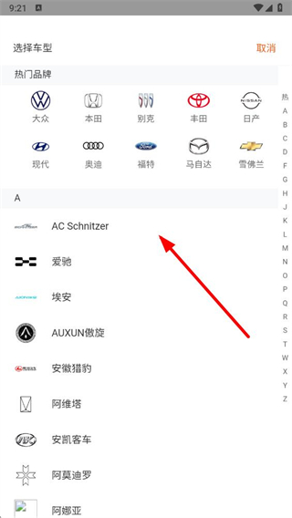 3、在选择车型页面,可从热门品牌图标或按字母分类的品牌列表中,选择自己车辆的品牌。