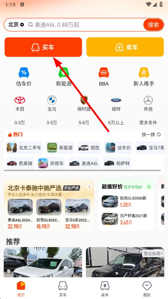 1、打开人人车二手车APP,点击首页的买车按钮,进入买车界面。