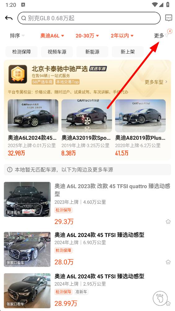 2、进入买车界面后,点击页面右上角更多选项,准备对车源进行筛选。