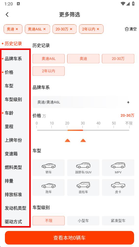 3、在更多筛选页面,依据品牌车系、价格、车型、车龄等多维度条件,筛选出符合自身需求的二手车。