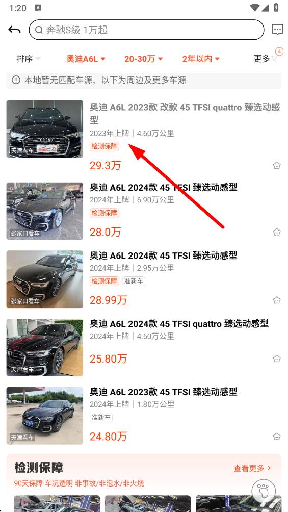 4、筛选完成后,在车源列表中点击感兴趣的车辆,进入车辆详情页。