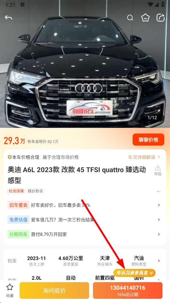 5、在车辆详情页,点击下方联系方式如电话按钮,与卖家沟通购车事宜。