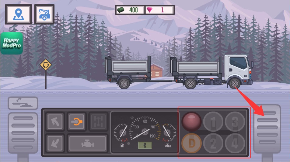 3、点击屏幕右下角的驾驶室按钮进入操作界面,这时会显示档位控制面板与后视镜画面。需要先熟悉各项仪表功能,包括转速表、油量指示和车速显示。