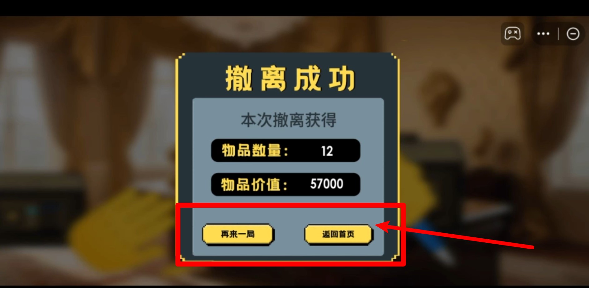 3.撤离成功后会显示获得的物品数量与价值,点击返回首页可整理物资,选择再来一局继续挑战冒险。