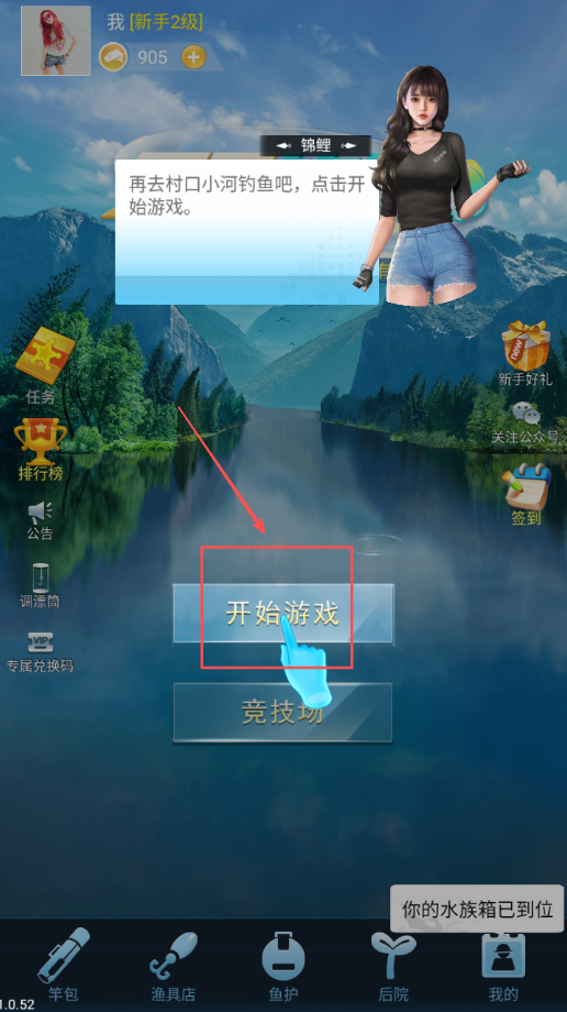 1、打开天天钓鱼最新版游戏,等待加载完成后进入主界面,在主界面找到开始钓鱼选项,点击后选择想要前往的钓场。