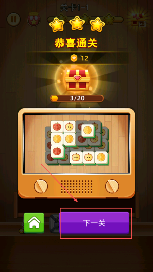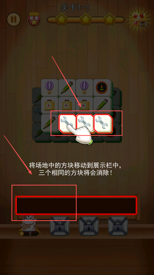 4、按照规则将这三个相同图案的方块放进指定盒子里,完成消除并获得积分,继续消除直到完成关卡任务。