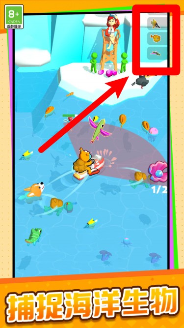 1.在海面上驾驶小船精准移动,瞄准目标捕捉各类海洋生物,完成右上角任务栏中的指定生物清单目标。