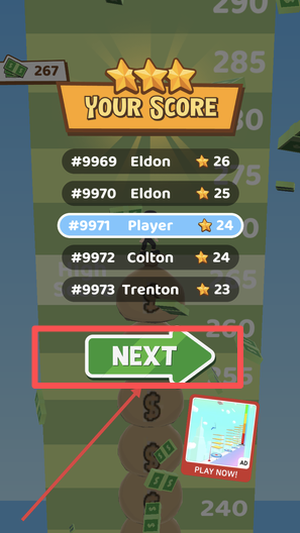 4、抵达终点后显示本局得分与星级评价,点击绿色NEXT按钮即可进入下一关,迎接更高难度的挑战。
