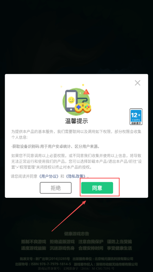 1、打开游戏后会看到游戏协议,得点一下同意,要是不同意的话,就没法继续使用游戏里的各种功能,这一步可不能跳过哦。