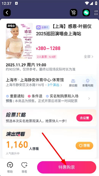 4、在演出详情页面,点击特惠购票,可进行该演出的购票操作。