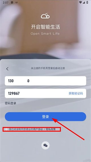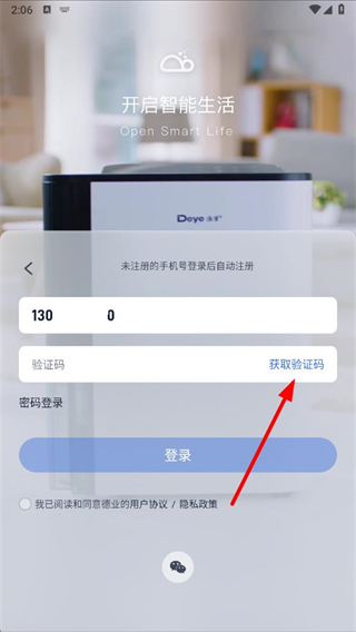 1、打开德业智能app,在登录页面点击手机图标,进入手机号登录页面。