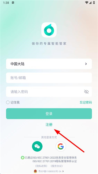 1、打开叮叮智能app,在登录页面点击注册选项,进入注册页面。