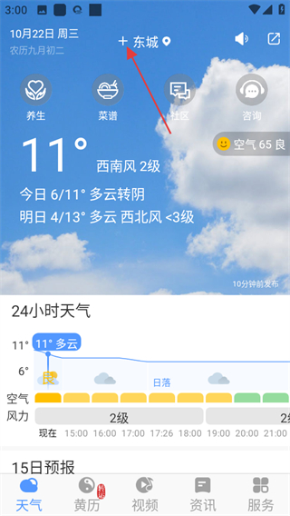 1、在黄历天气首页,点击页面上方+东城,可进入添加城市页面。
