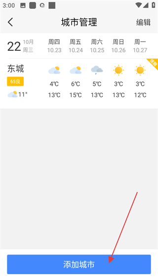 2、在城市管理页面,点击添加城市可再次进入添加城市流程。