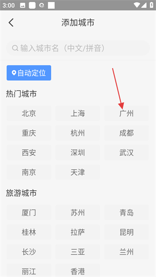 3、在添加城市页面,可选择热门城市如广州,或搜索城市进行添加。