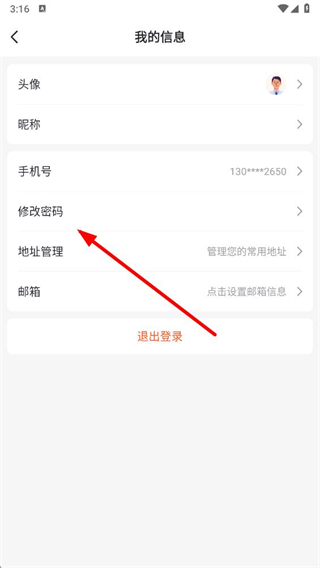 3、在我的信息页面点击修改密码选项,进入设置密码页面。