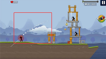 3、通过手指在屏幕上滑动来调整火箭筒的射击角度与力度,观察弹道轨迹预判落点。确定目标位置后松开手指即可发射炮弹,注意避开障碍物提高命中率。