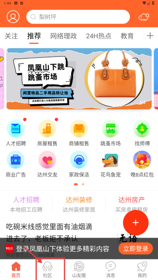 1、打开本地资讯应用,点击底部社区选项,进入社区页面。