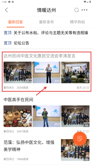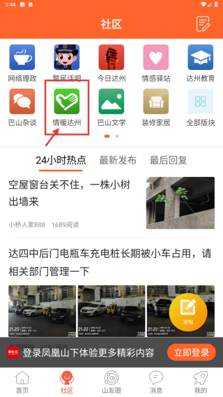 2、在社区页面,点击情暖达州板块,浏览该板块下的资讯列表。