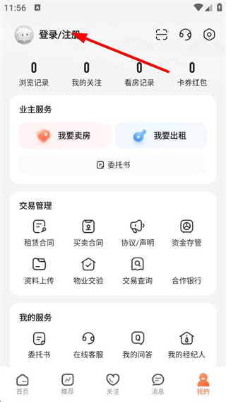 2、在个人中心页面,点击登录/注册,进入验证码登录页面。