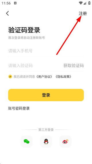 3、在验证码登录页面,点击右上角的注册,进入注册账号页面。