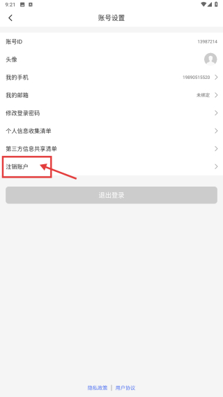 3、在账号设置页面,点击注销账户选项,弹出注销确认提示框。