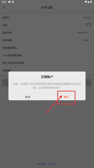 4、在注销确认提示框中,点击确定按钮,完成账号注销操作。