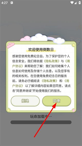 1、在欢迎使用倒数日的弹窗中,点击同意,进入APP首页。