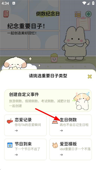 3、在重要日子类型选择页面,点击生日倒数,进入生日倒数设置页面。