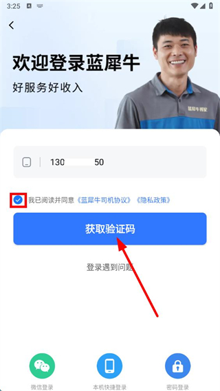 1、在蓝犀牛司机端app界面点击登录注册按钮,进入登录注册页面。