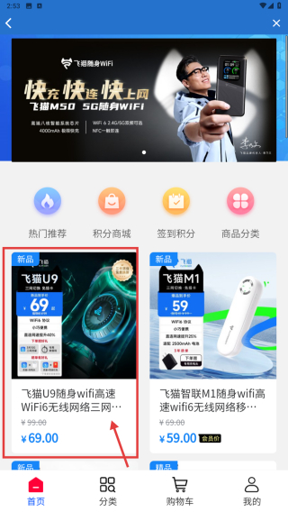 3、在首页商品列表中,找到飞猫U9随身wifi商品条目,点击进入商品详情页。
