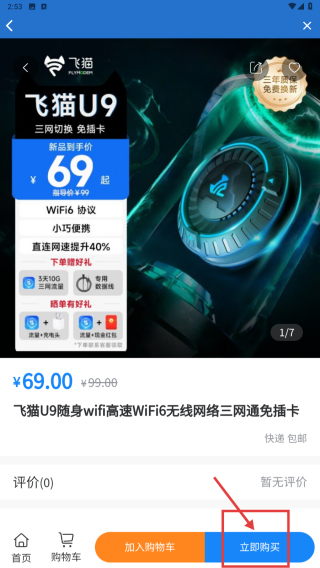 4、在商品详情页,点击立即购买按钮,完成该随身WiFi商品的购买操作。