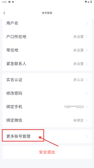 3、在账号管理页面,点击更多账号管理选项,进入更多账号设置页面。