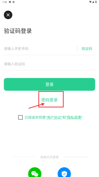 3、在登录方式选择界面,点击密码登录选项,进入手机号密码登录页面。