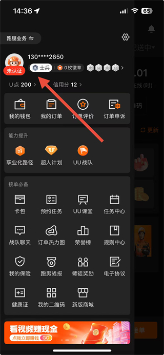 1、在UU跑腿跑男端左上角点击个人页面,点击头像区域,进入个人信息页面。