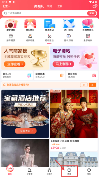 1、打开婚庆类应用,点击底部商城选项,进入商城页面。