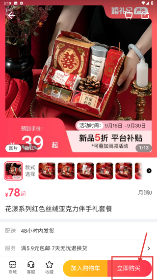 4、在商品详情页,点击立即购买按钮,完成该婚庆伴手礼商品的购买操作。